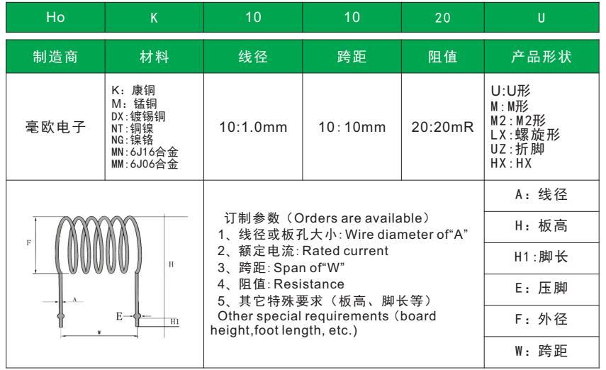 康铜电阻: ●材质: 康铜 ●线径: 0.5~4.0 ●阻值:1mR~500mR ●跨距:5~100mm ●精度 :±3% 5% 10% ●温度系数(TCR):≤50ppm ● 低电感 ● 环保: ROHS REACH ●接受订制