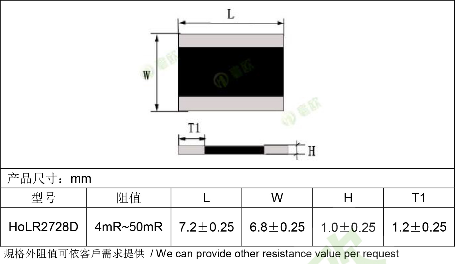 Sealing alloy resistance LR2728D series: ● Power: 4W ● Resistance value: 4mR~50mR ● Accuracy: ± 1% ± 5% ● Temperature coefficient (TCR): ≤± 25ppm, ± 50ppm ● Meet ROHS requirements and halogen-free requirements