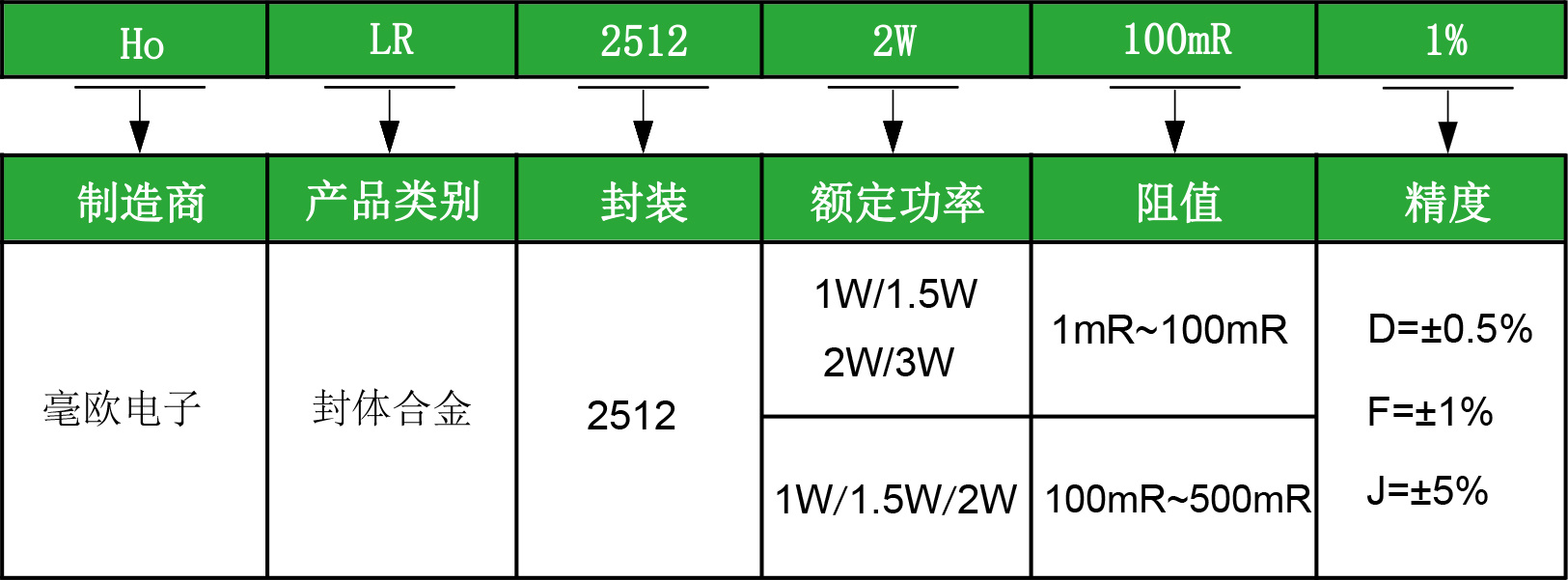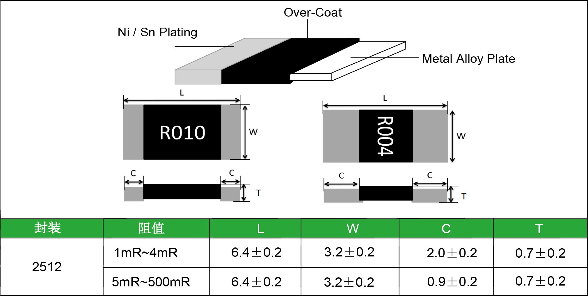 Sealing alloy resistance LR2512 series: ● Power: 1W~3W ● Resistance value: 1mR~500mR ● Accuracy: ± 0.5% ± 1% ± 5% ● Temperature coefficient (TCR): ≤± 50ppm, ± 75ppm ● Meet ROHS requirements and halogen-free requirements