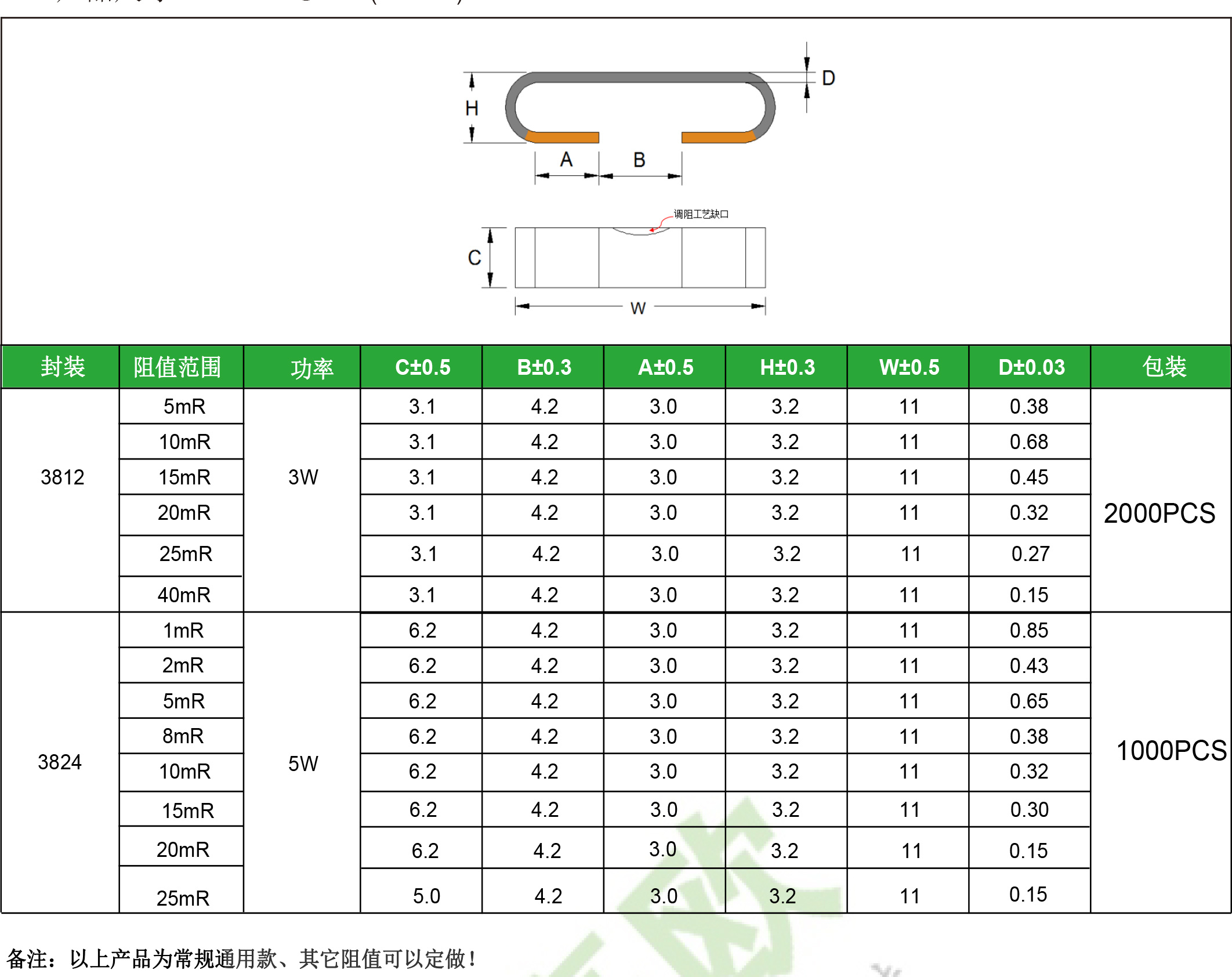 Bare alloy resistance HoRS series: ● Package size: 3824/3812 ● Power: 5W, 3W ● Resistance value: 1mR~25mR/2mR~30mR ● Accuracy: ± 0.5% ± 1% ± 5% ● Temperature coefficient (TCR): ≤ 50ppm ● Low inductance ● Environmental protection: ROHS ● The product meets the requirements of AEC-Q200 ● Accept customization