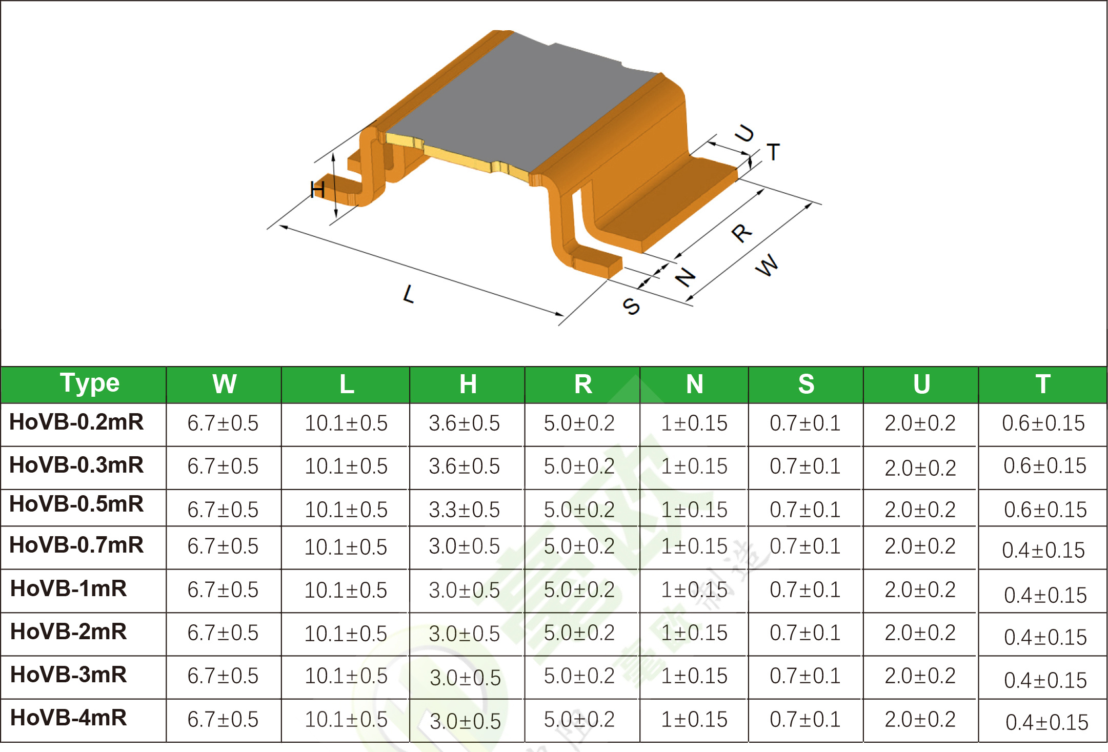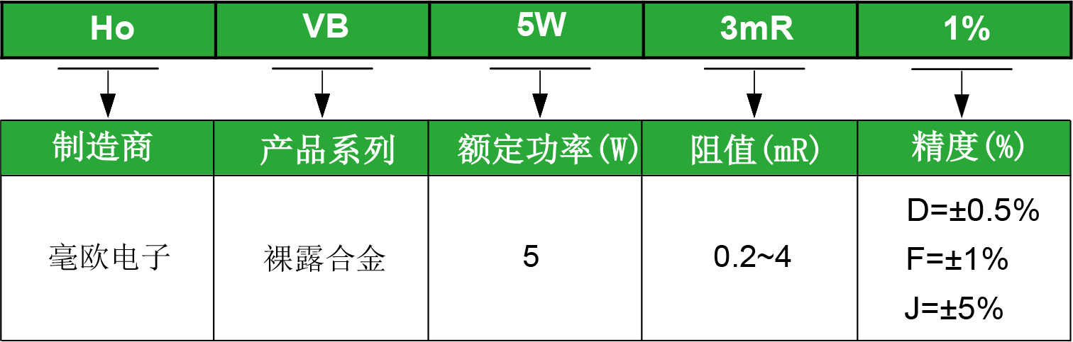 Bare alloy resistance HoVB series: ● Power: 5W ● Resistance value: 0.2mR~4mR ● Accuracy: ± 0.5% ± 1% ± 5% ● Temperature coefficient (TCR): ≤ 50ppm ● Low inductance ● Products meet ROHS requirements ● The product meets the requirements of AEC-Q200 ● Accept customization