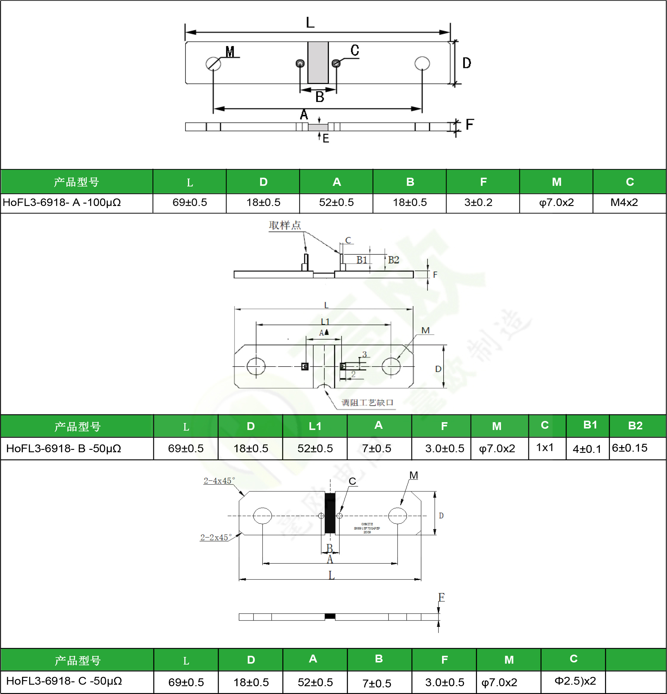Automobile diverter: HoFL3-6918 ● Rated current: 300A ● Resistance value: 50 μ Ω、100 μ Ω ● Product accuracy: 0.2%~5% ● Accept customization
